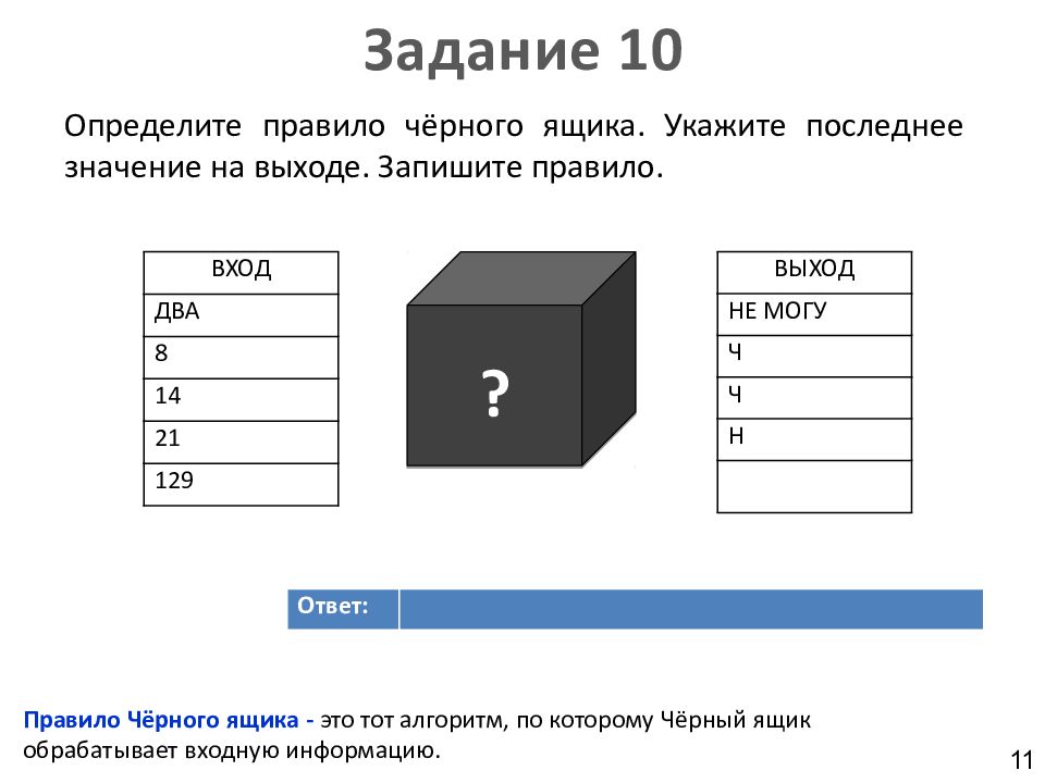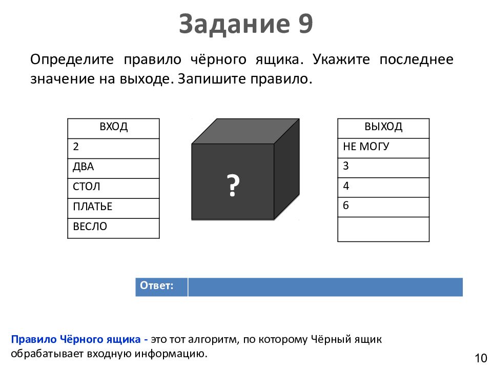 Определите правило чёрного ящика. Укажите последнее значение на выходе. Запишите правило. Ответ: ? ВХОД БАНЩИК МОНЕТА ЛОТ КОЛОС ВЫХОД 2 3 1 Правило Чёрного ящика - это тот алгоритм, по которому Чёрный ящик обрабатывает входную информацию. 9