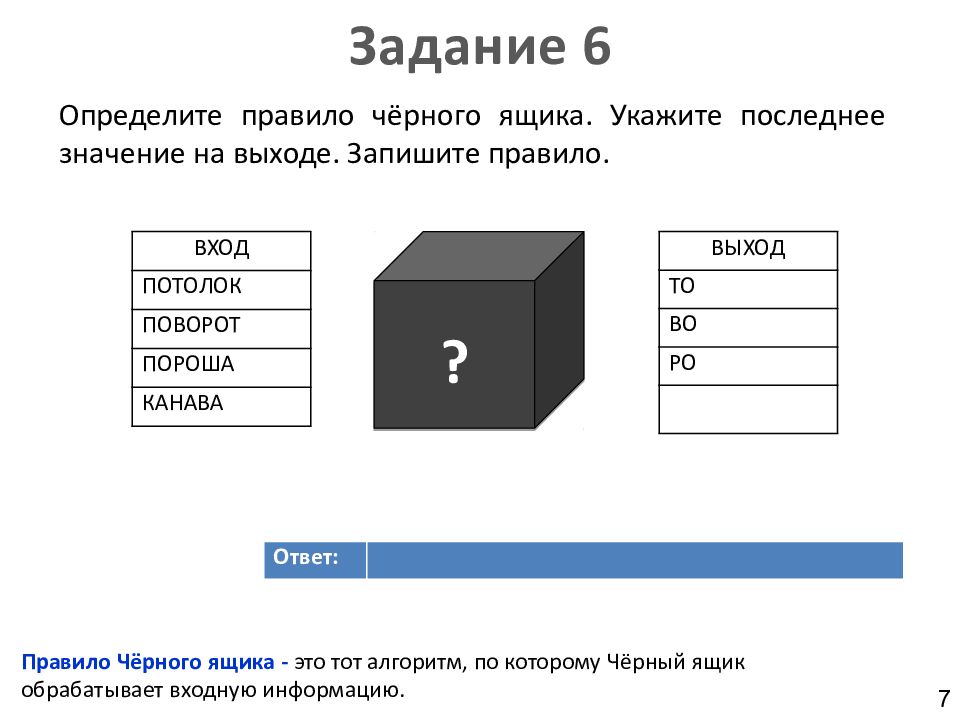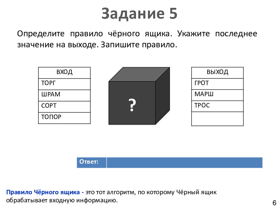 Определите правило чёрного ящика. Укажите последнее значение на выходе. Запишите правило. Ответ: ? ВХОД ТОРГ ШРАМ СОРТ ТОПОР ВЫХОД ГРОТ МАРШ ТРОС Правило Чёрного ящика - это тот алгоритм, по которому Чёрный ящик обрабатывает входную информацию. 6