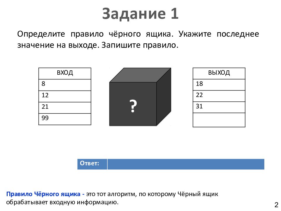 Определите правило чёрного ящика. Укажите последнее значение на выходе. Запишите правило. ВХОД 8 12 21 99 ВЫХОД 18 22 31 Ответ: ? Правило Чёрного ящика - это тот алгоритм, по которому Чёрный ящик обрабатывает входную информацию. 2