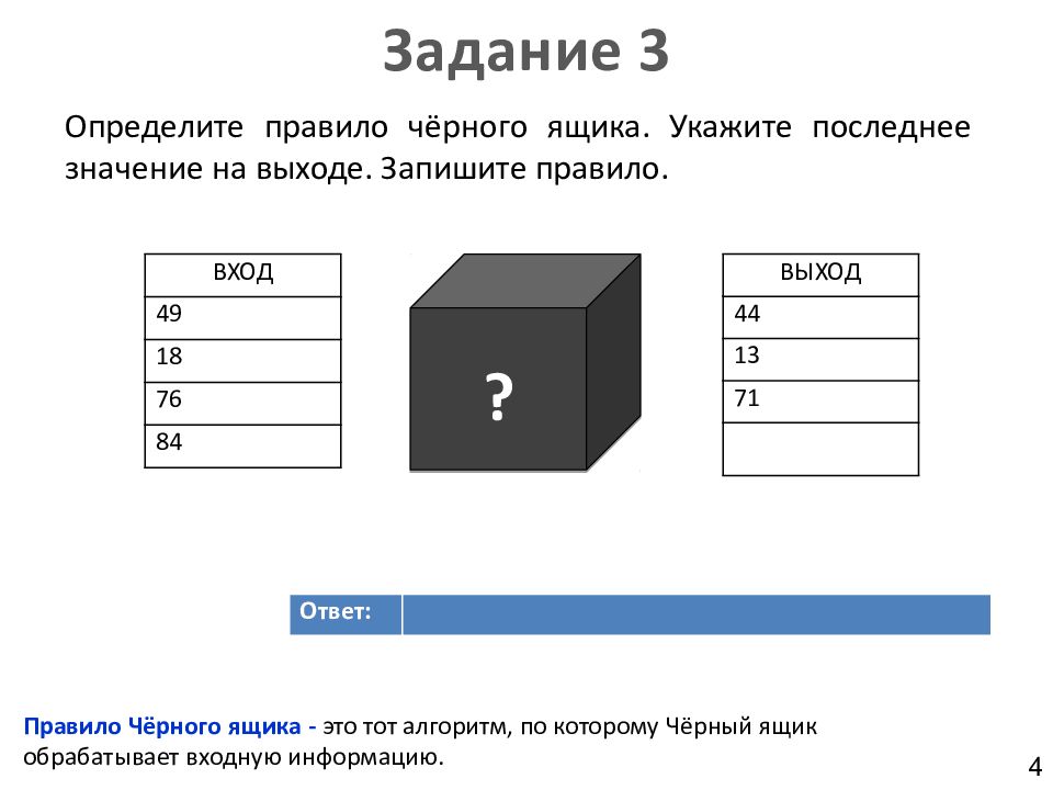 Определите правило чёрного ящика. Укажите последнее значение на выходе. Запишите правило. Ответ: ? ВХОД 49 18 76 84 ВЫХОД 44 13 71 Правило Чёрного ящика - это тот алгоритм, по которому Чёрный ящик обрабатывает входную информацию. 4