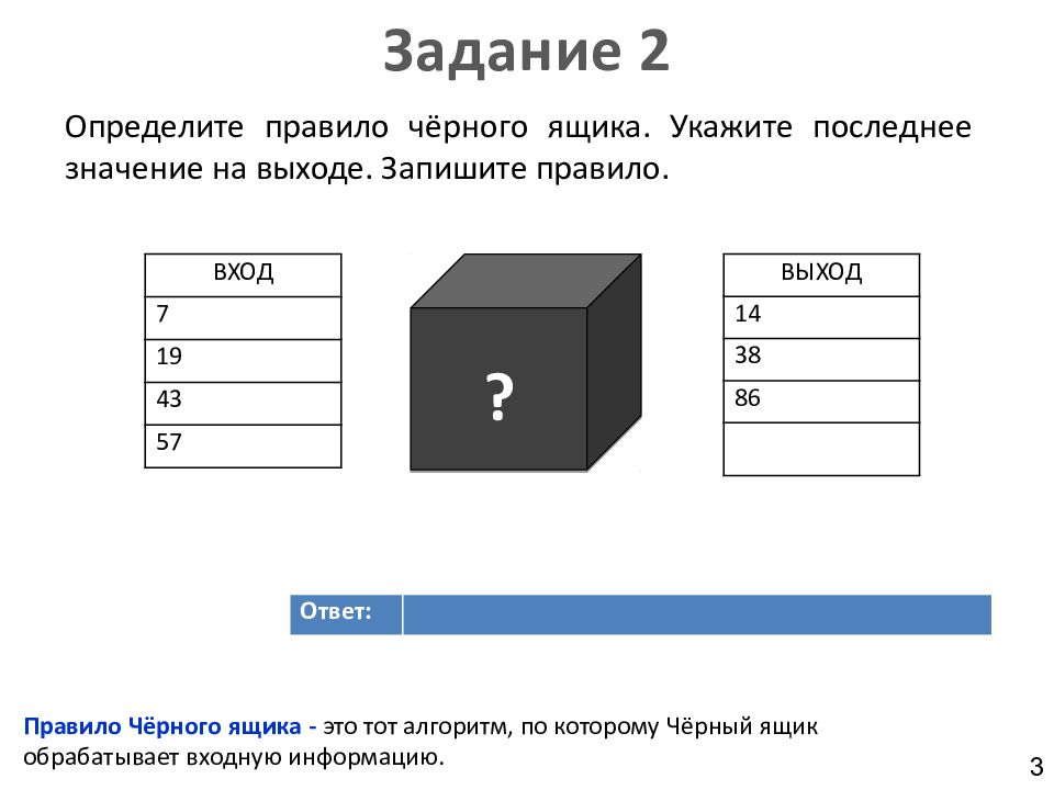 Определите правило чёрного ящика. Укажите последнее значение на выходе. Запишите правило. Ответ: ? ВХОД 7 19 43 57 ВЫХОД 14 38 86 Правило Чёрного ящика - это тот алгоритм, по которому Чёрный ящик обрабатывает входную информацию. 3