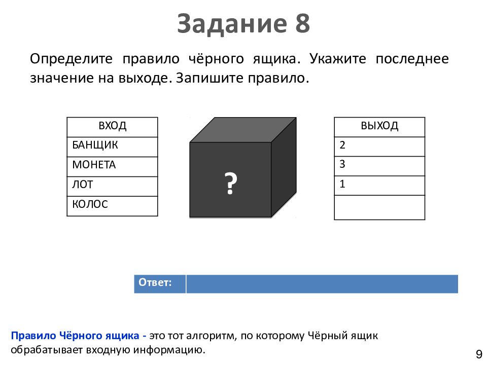 Определите правило чёрного ящика. Укажите последнее значение на выходе. Запишите правило. Ответ: ? ВХОД БАРАБАН БРИКЕТ МОЛОКО ПУЛОВЕР ВЫХОД БАН КЕТ КО Правило Чёрного ящика - это тот алгоритм, по которому Чёрный ящик обрабатывает входную информацию. 8