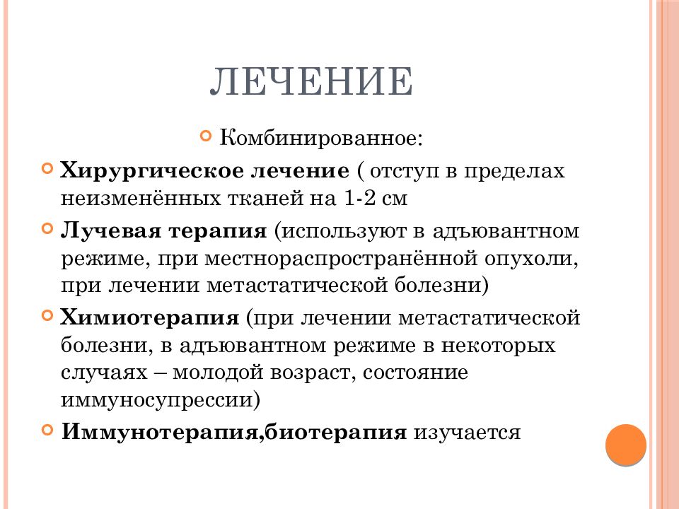 Комбинированное: Хирургическое лечение ( отступ в пределах неизменённых тканей на 1-2 см Лучевая терапия (используют в адъювантном режиме, при местнораспространённой опухоли, при лечении метастатической болезни) Химиотерапия (при лечении метастатической болезни, в адъювантном режиме в некоторых случаях – молодой возраст, состояние иммуносупрессии ) Иммунотерапия,биотерапия изучается