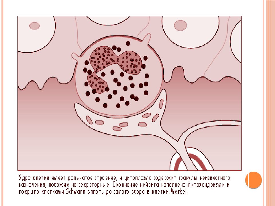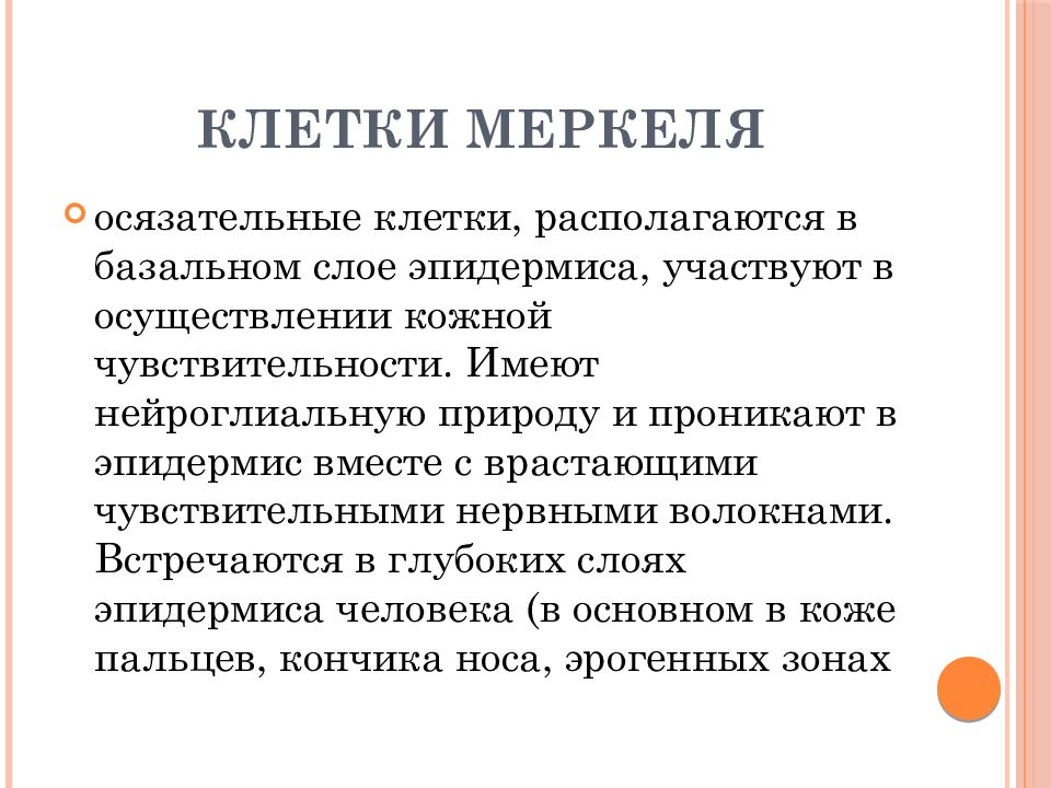 осязательные клетки, располагаются в базальном слое эпидермиса, участвуют в осуществлении кожной чувствительности. Имеют нейроглиальную природу и проникают в эпидермис вместе с врастающими чувствительными нервными волокнами. Встречаются в глубоких слоях эпидермиса человека (в основном в коже пальцев, кончика носа, эрогенных зонах