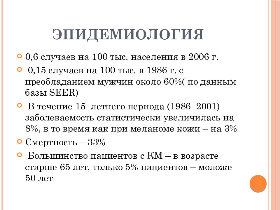 0,6 случаев на 100 тыс. населения в 2006 г. 0,15 случаев на 100 тыс. в 1986 г. с преобладанием мужчин около 60 %( по данным базы SEER ) В течение 15–летнего периода (1986–2001) заболеваемость статистически увеличилась на 8%, в то время как при меланоме кожи – на 3 % Смертность – 33% Большинство пациентов с КМ – в возрасте старше 65 лет, только 5% пациентов – моложе 50 лет