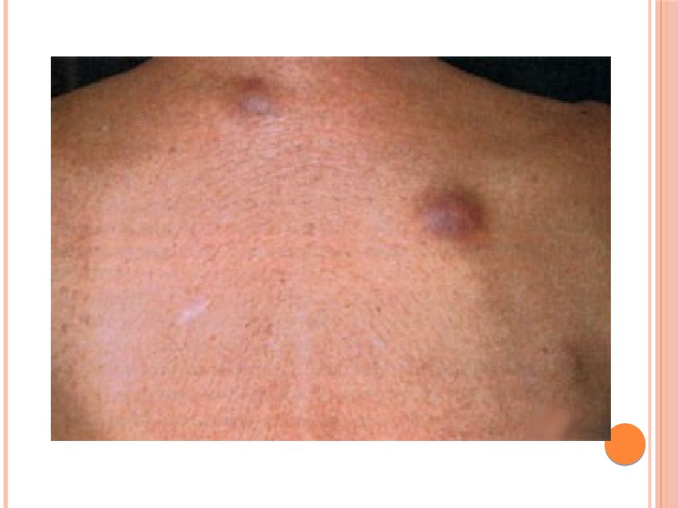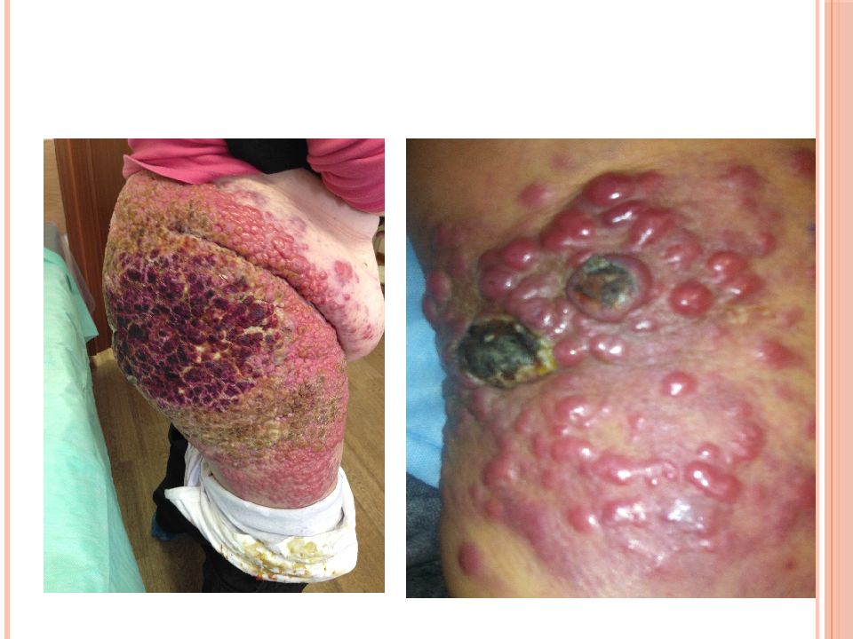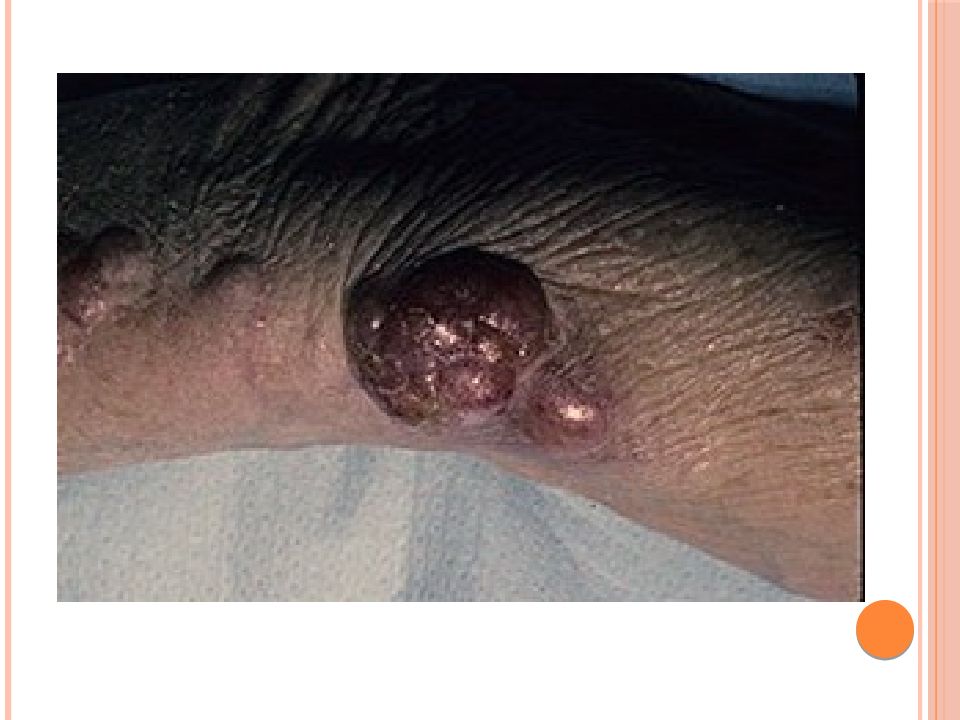 В виле единичного безболезненного однородного неизъязвленного красно–фиолетового узла Могут быть изъявления, сателлиты и мультифокальное расположение Чаще располагается на подверженных УФ–облучению участках кожи (голова и шея, конечности ). На слизистых оболочках 5 % от общего числа заболевших.