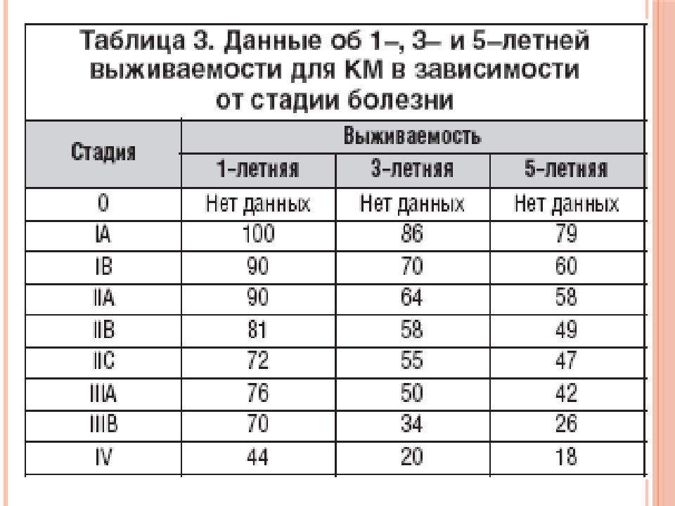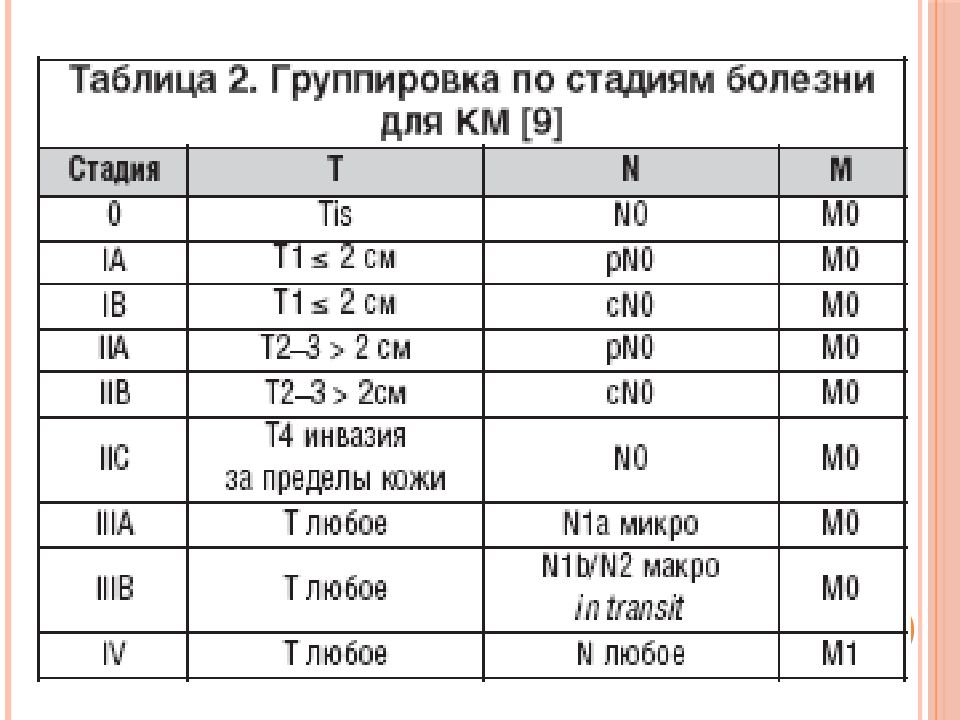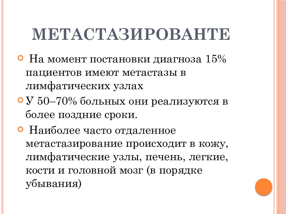 На момент постановки диагноза 15% пациентов имеют метастазы в лимфатических узлах У 50–70% больных они реализуются в более поздние сроки. Наиболее часто отдаленное метастазирование происходит в кожу, лимфатические узлы, печень, легкие, кости и головной мозг (в порядке убывания)