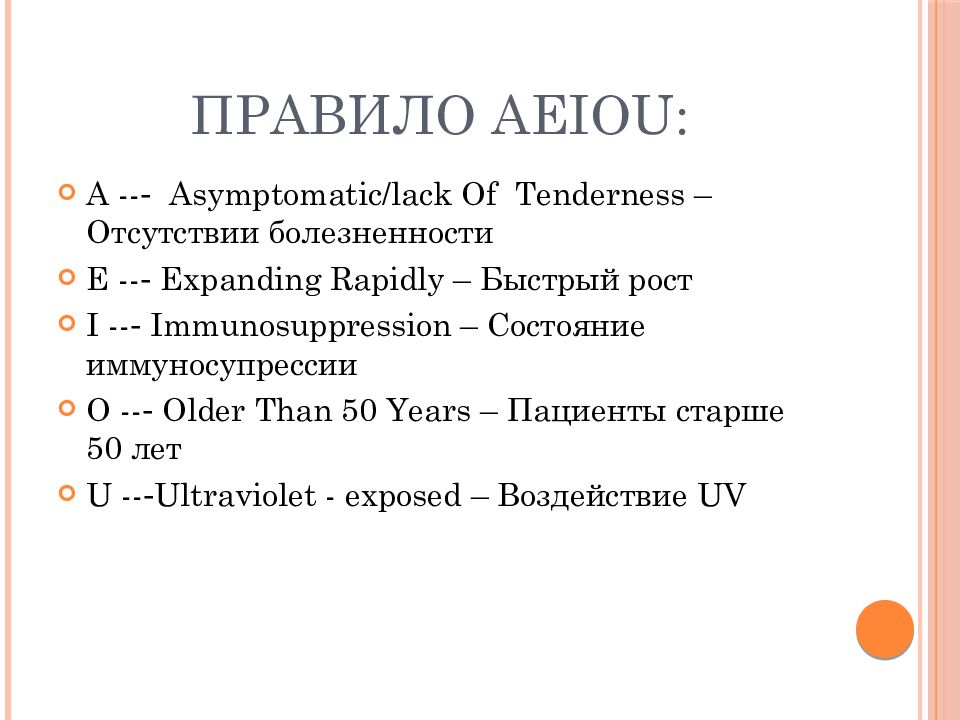A --‐ Asymptomatic/lack Of Tenderness – Отсутствии болезненности E --‐ Expanding Rapidly – Быстрый рост I --‐ Immunosuppression – Состояние иммуносупрессии O --‐ Older Than 50 Years – Пациенты с тарше 50 лет U --‐ Ultraviolet - exposed – Воздействие UV