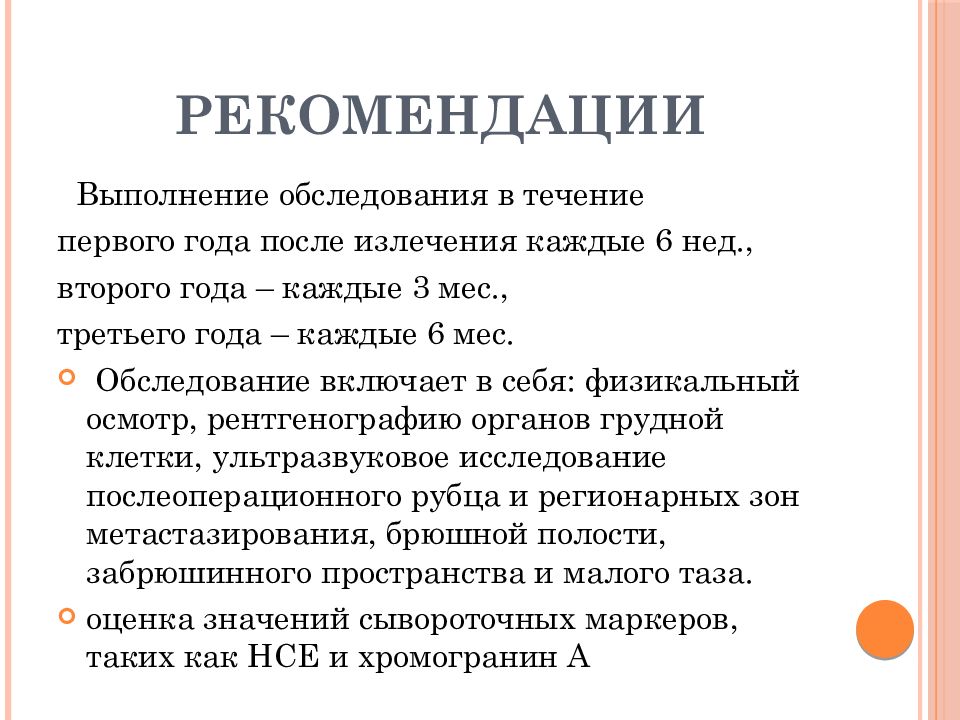 В ыполнение обследования в течение первого года после излечения каждые 6 нед., второго года – каждые 3 мес., третьего года – каждые 6 мес. Обследование включает в себя: физикальный осмотр, рентгенографию органов грудной клетки, ультразвуковое исследование послеоперационного рубца и регионарных зон метастазирования, брюшной полости, забрюшинного пространства и малого таза. оценка значений сывороточных маркеров, таких как НСЕ и хромогранин А
