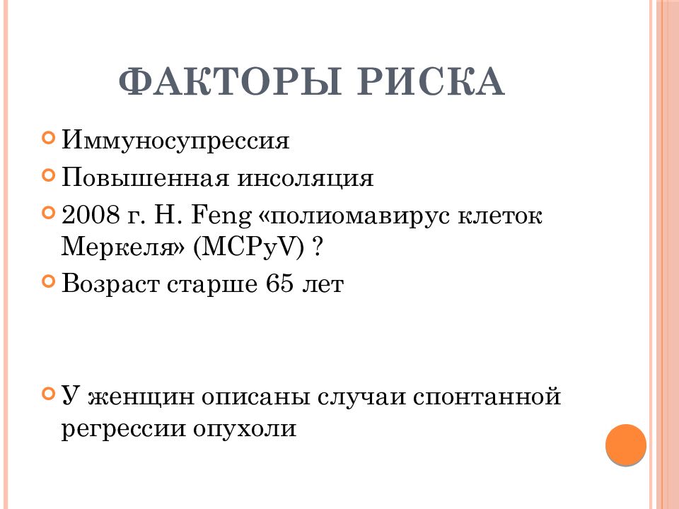 Иммуносупрессия Повышенная инсоляция 2008 г. Н. Feng « полиомавирус клеток Меркеля » ( MCPyV ) ? Возраст старше 65 лет У женщин описаны случаи спонтанной регрессии опухоли