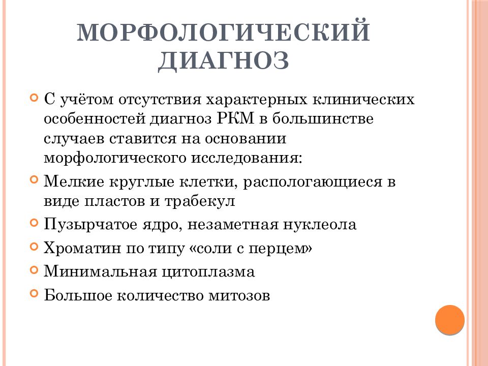 С учётом отсутствия характерных клинических особенностей диагноз РКМ в большинстве случаев ставится на основании морфологического исследования: Мелкие круглые клетки, распологающиеся в виде пластов и трабекул Пузырчатое ядро, незаметная нуклеола Хроматин по типу «соли с перцем» Минимальная цитоплазма Большое количество митозов