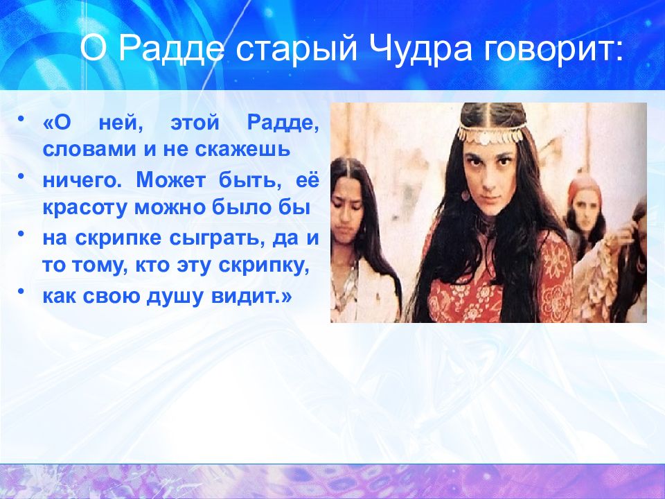 «О ней, этой Радде, словами и не скажешь ничего. Может быть, её красоту можно было бы на скрипке сыграть, да и то тому, кто эту скрипку, как свою душу видит.»