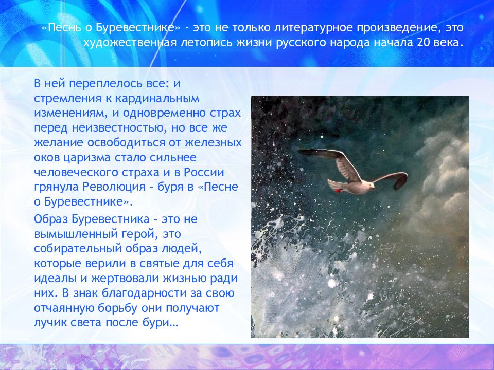 В ней переплелось все: и стремления к кардинальным изменениям, и одновременно страх перед неизвестностью, но все же желание освободиться от железных оков царизма стало сильнее человеческого страха и в России грянула Революция – буря в «Песне о Буревестнике». Образ Буревестника – это не вымышленный герой, это собирательный образ людей, которые верили в святые для себя идеалы и жертвовали жизнью ради них. В знак благодарности за свою отчаянную борьбу они получают лучик света после бури…