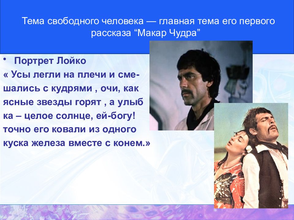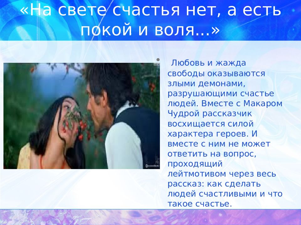 Слайд 9: Тема свободного человека — главная тема его первого рассказа “Макар Чудра ”