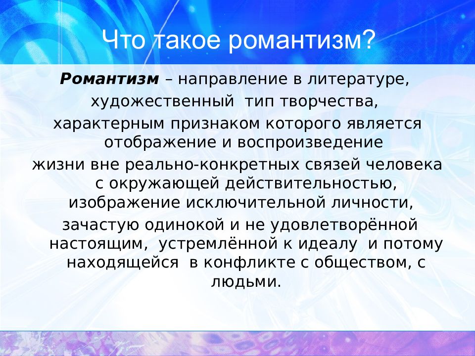 Романтизм – направление в литературе, художественный тип творчества, характерным признаком которого является отображение и воспроизведение жизни вне реально-конкретных связей человека с окружающей действительностью, изображение исключительной личности, зачастую одинокой и не удовлетворённой настоящим, устремлённой к идеалу и потому находящейся в конфликте с обществом, с людьми.