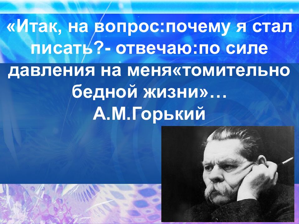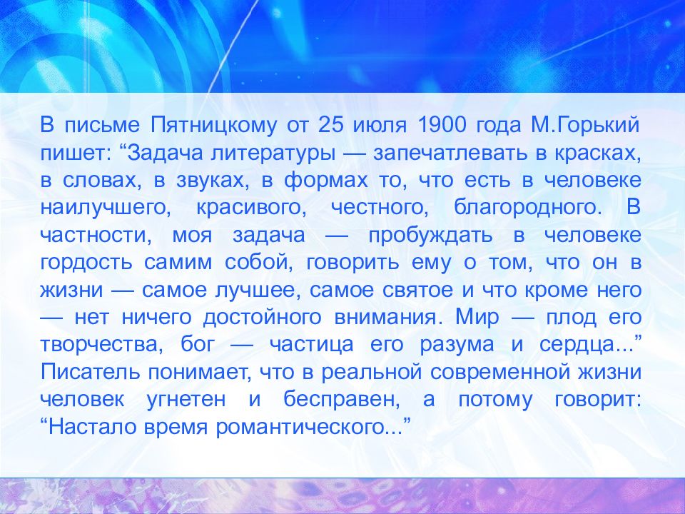В письме Пятницкому от 25 июля 1900 года М.Горький пишет: “Задача литературы — запечатлевать в красках, в словах, в звуках, в формах то, что есть в человеке наилучшего, красивого, честного, благородного. В частности, моя задача — пробуждать в человеке гордость самим собой, говорить ему о том, что он в жизни — самое лучшее, самое святое и что кроме него — нет ничего достойного внимания. Мир — плод его творчества, бог — частица его разума и сердца...” Писатель понимает, что в реальной современной жизни человек угнетен и бесправен, а потому говорит: “Настало время романтического...”