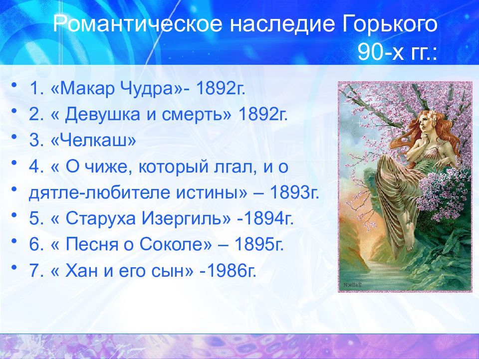 1. «Макар Чудра »- 1892г. 2. « Девушка и смерть» 1892г. 3. « Челкаш » 4. « О чиже, который лгал, и о дятле-любителе истины» – 1893г. 5. « Старуха Изергиль» -1894г. 6. « Песня о Соколе» – 1895г. 7. « Хан и его сын» -1986г.