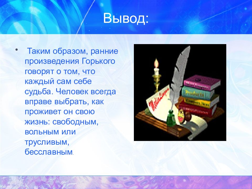 Таким образом, ранние произведения Горького говорят о том, что каждый сам себе судьба. Человек всегда вправе выбрать, как проживет он свою жизнь: свободным, вольным или трусливым, бесславным.