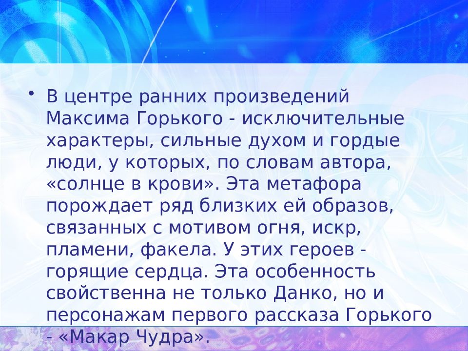 В центре ранних произведений Максима Горького - исключительные характеры, сильные духом и гордые люди, у которых, по словам автора, «солнце в крови». Эта метафора порождает ряд близких ей образов, связанных с мотивом огня, искр, пламени, факела. У этих героев - горящие сердца. Эта особенность свойственна не только Данко, но и персонажам первого рассказа Горького - «Макар Чудра ».
