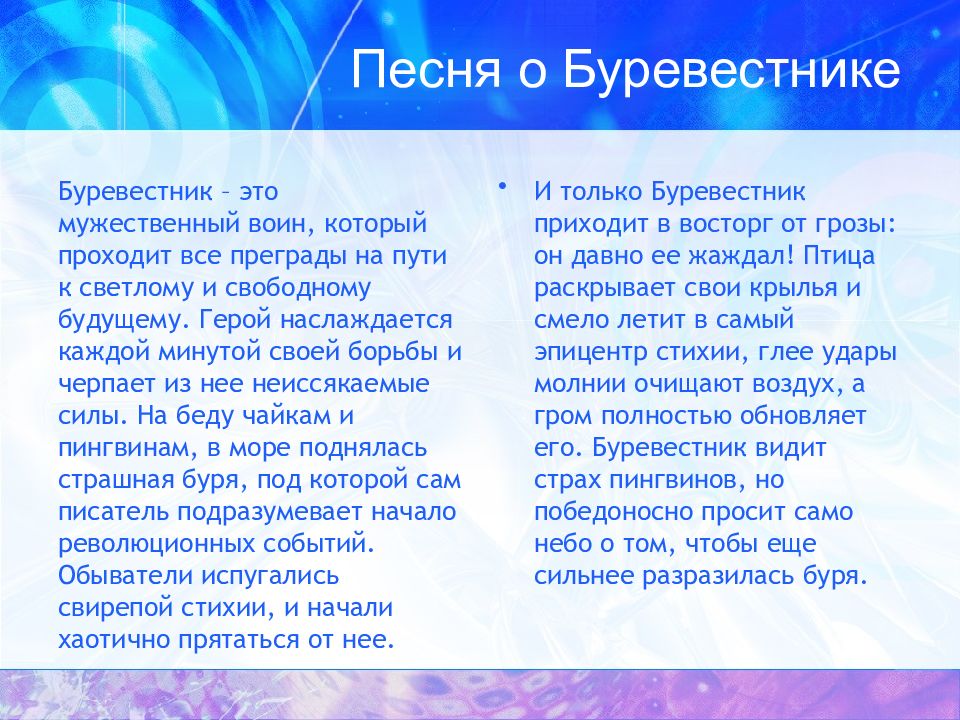 Буревестник – это мужественный воин, который проходит все преграды на пути к светлому и свободному будущему. Герой наслаждается каждой минутой своей борьбы и черпает из нее неиссякаемые силы. На беду чайкам и пингвинам, в море поднялась страшная буря, под которой сам писатель подразумевает начало революционных событий. Обыватели испугались свирепой стихии, и начали хаотично прятаться от нее. И только Буревестник приходит в восторг от грозы: он давно ее жаждал! Птица раскрывает свои крылья и смело летит в самый эпицентр стихии, глее удары молнии очищают воздух, а гром полностью обновляет его. Буревестник видит страх пингвинов, но победоносно просит само небо о том, чтобы еще сильнее разразилась буря.