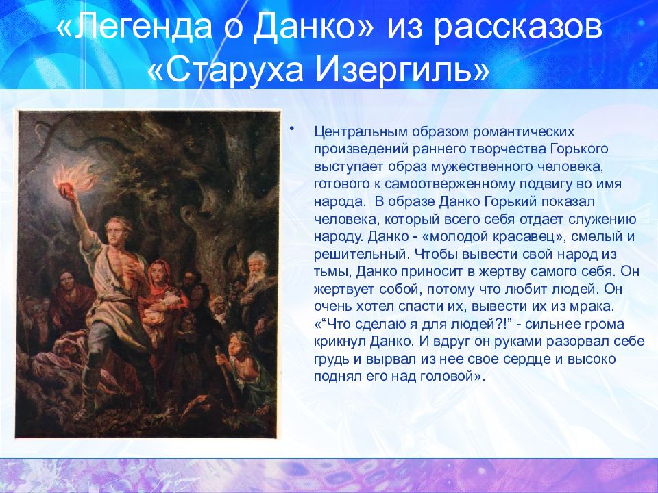 Центральным образом романтических произведений раннего творчества Горького выступает образ мужественного человека, готового к самоотверженному подвигу во имя народа. В образе Данко Горький показал человека, который всего себя отдает служению народу. Данко - «молодой красавец», смелый и решительный. Чтобы вывести свой народ из тьмы, Данко приносит в жертву самого себя. Он жертвует собой, потому что любит людей. Он очень хотел спасти их, вывести их из мрака. «“Что сделаю я для людей?!” - сильнее грома крикнул Данко. И вдруг он руками разорвал себе грудь и вырвал из нее свое сердце и высоко поднял его над головой».