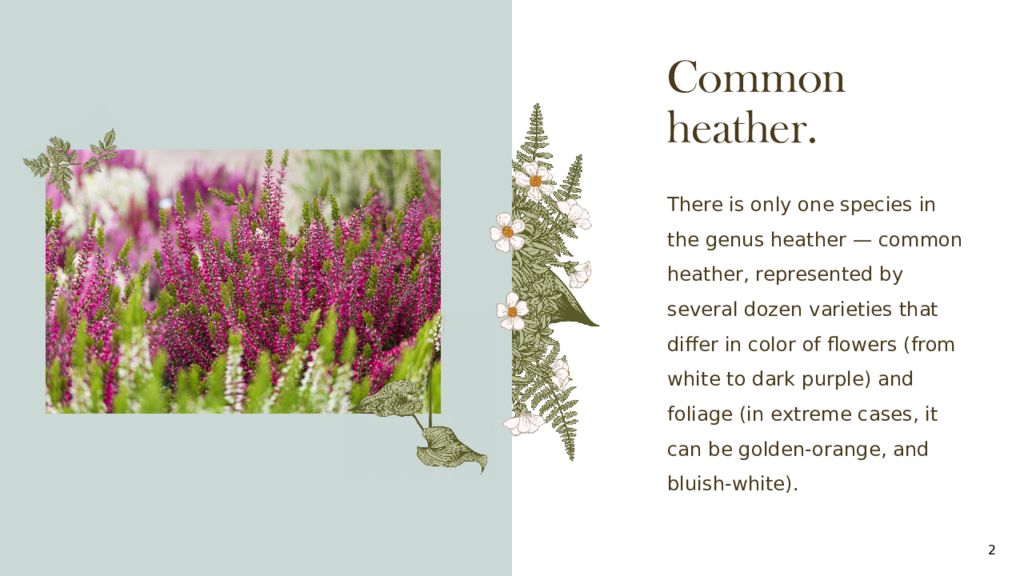 There is only one species in the genus heather — common heather, represented by several dozen varieties that differ in color of flowers (from white to dark purple) and foliage (in extreme cases, it can be golden-orange, and bluish-white). 2
