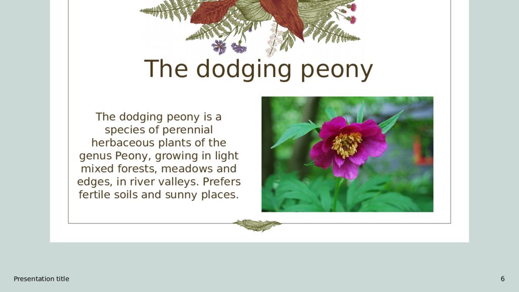 The dodging peony is a species of perennial herbaceous plants of the genus Peony, growing in light mixed forests, meadows and edges, in river valleys. Prefers fertile soils and sunny places. Presentation title 6