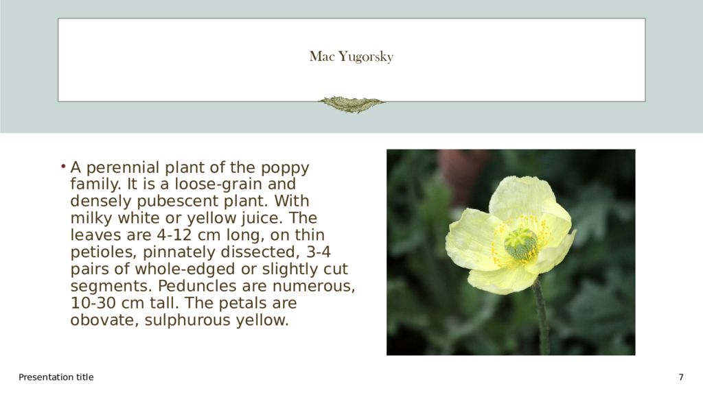 Presentation title 7 A perennial plant of the poppy family. It is a loose-grain and densely pubescent plant. With milky white or yellow juice. The leaves are 4-12 cm long, on thin petioles, pinnately dissected, 3-4 pairs of whole-edged or slightly cut segments. Peduncles are numerous, 10-30 cm tall. The petals are obovate, sulphurous yellow.