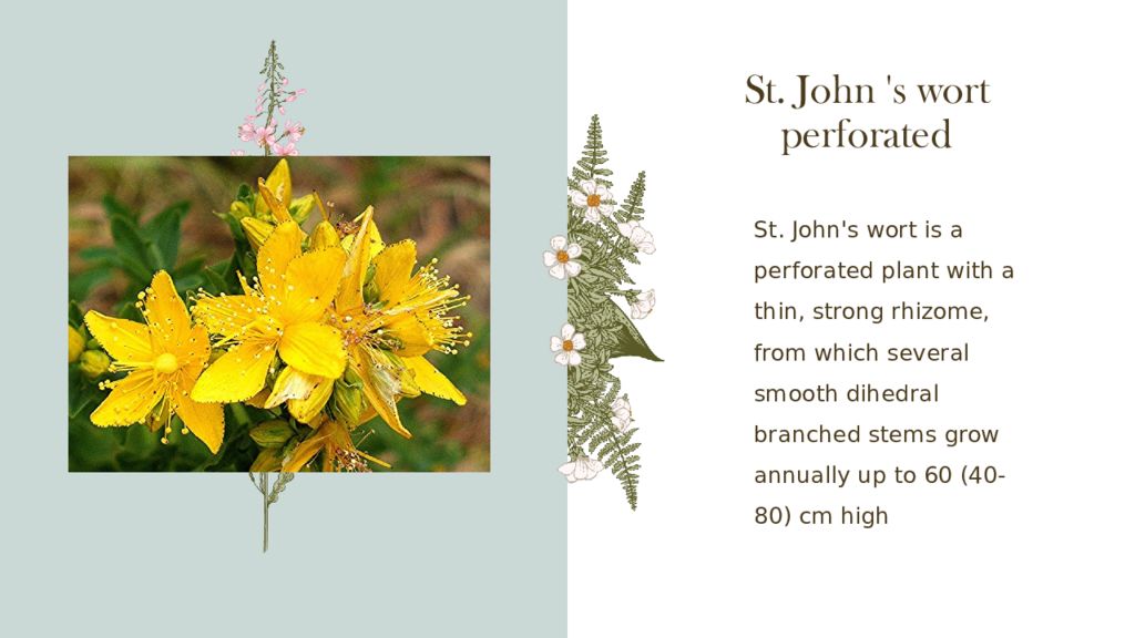 St. John's wort is a perforated plant with a thin, strong rhizome, from which several smooth dihedral branched stems grow annually up to 60 (40-80) cm high