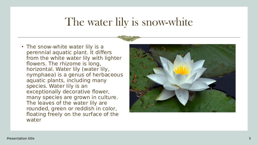 The snow-white water lily is a perennial aquatic plant. It differs from the white water lily with lighter flowers. The rhizome is long, horizontal. Water lily (water lily, nymphaea ) is a genus of herbaceous aquatic plants, including many species. Water lily is an exceptionally decorative flower, many species are grown in culture. The leaves of the water lily are rounded, green or reddish in color, floating freely on the surface of the water Presentation title 5