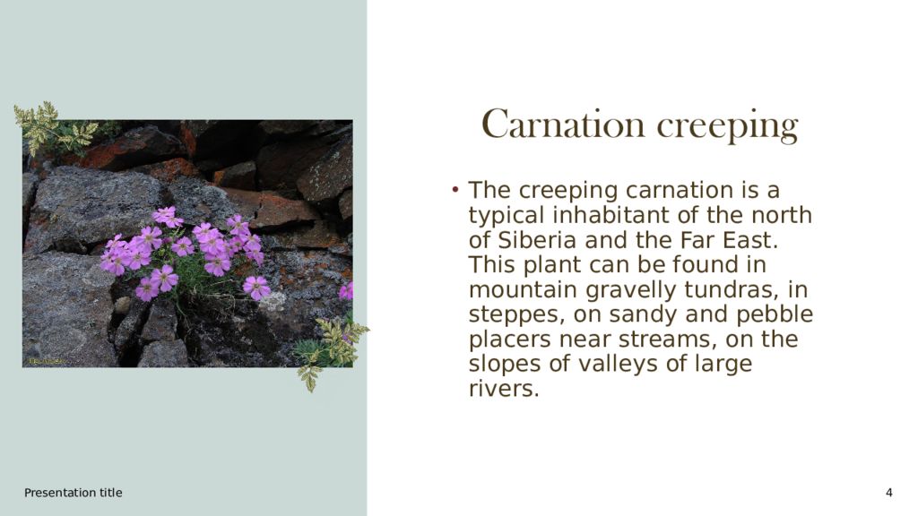 Presentation title 4 The creeping carnation is a typical inhabitant of the north of Siberia and the Far East. This plant can be found in mountain gravelly tundras, in steppes, on sandy and pebble placers near streams, on the slopes of valleys of large rivers.