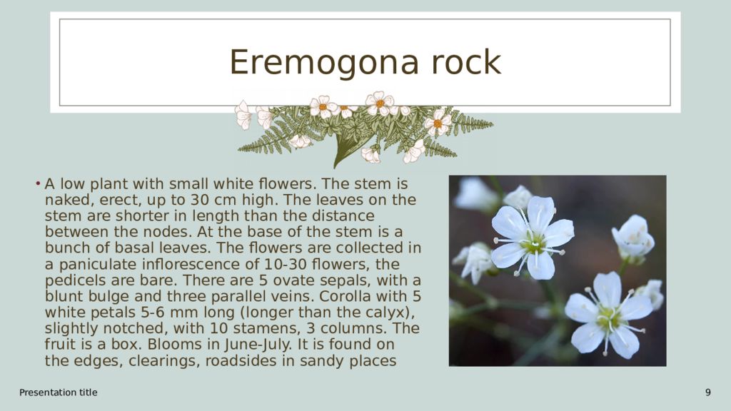 A low plant with small white flowers. The stem is naked, erect, up to 30 cm high. The leaves on the stem are shorter in length than the distance between the nodes. At the base of the stem is a bunch of basal leaves. The flowers are collected in a paniculate inflorescence of 10-30 flowers, the pedicels are bare. There are 5 ovate sepals, with a blunt bulge and three parallel veins. Corolla with 5 white petals 5-6 mm long (longer than the calyx), slightly notched, with 10 stamens, 3 columns. The fruit is a box. Blooms in June-July. It is found on the edges, clearings, roadsides in sandy places Presentation title 9