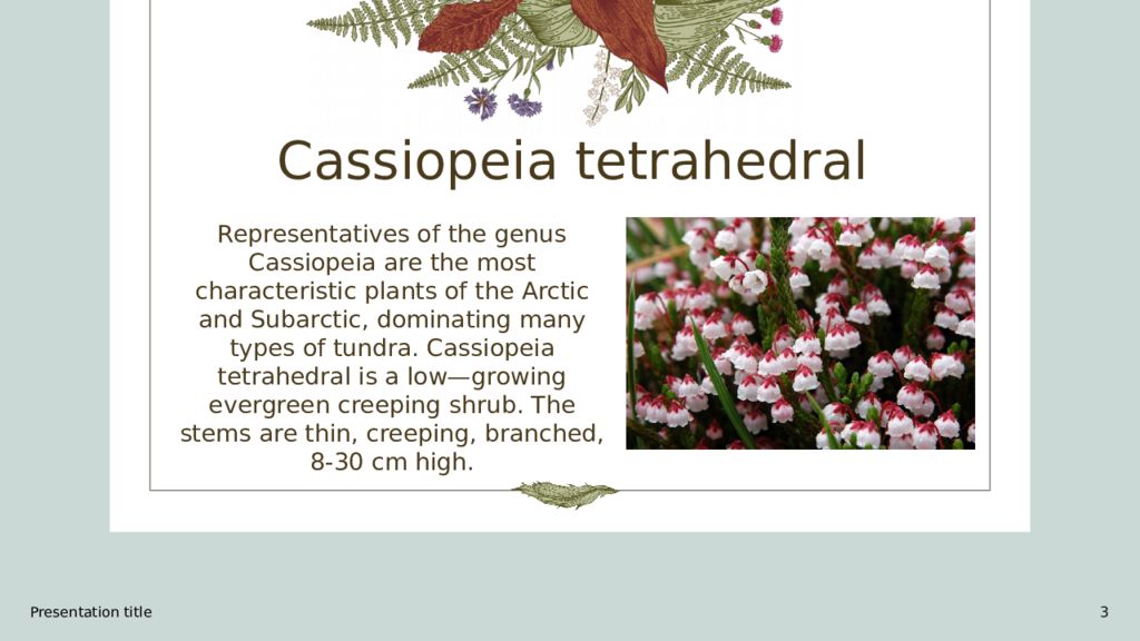 Representatives of the genus Cassiopeia are the most characteristic plants of the Arctic and Subarctic, dominating many types of tundra. Cassiopeia tetrahedral is a low—growing evergreen creeping shrub. The stems are thin, creeping, branched, 8-30 cm high. Presentation title 3