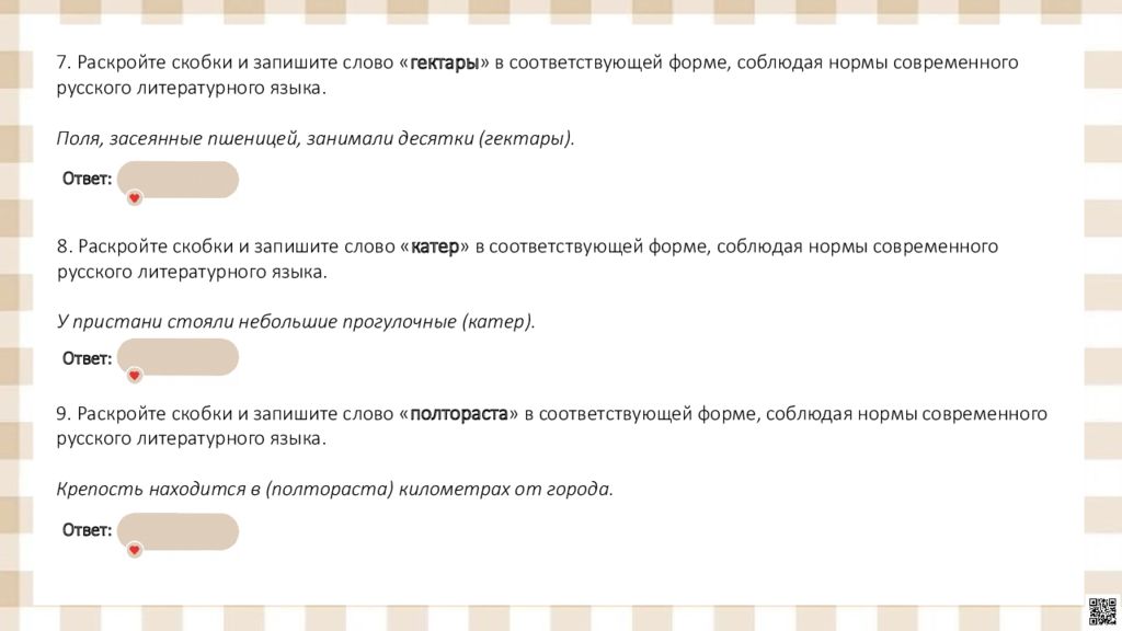 7. Раскройте скобки и запишите слово « гектары » в соответствующей форме, соблюдая нормы современного русского литературного языка. Поля, засеянные пшеницей, занимали десятки (гектары). Ответ: гектаров 8. Раскройте скобки и запишите слово « катер » в соответствующей форме, соблюдая нормы современного русского литературного языка. У пристани стояли небольшие прогулочные (катер). Ответ: катера 9. Раскройте скобки и запишите слово « полтораста » в соответствующей форме, соблюдая нормы современного русского литературного языка. Крепость находится в (полтораста) километрах от города. Ответ: полутораста