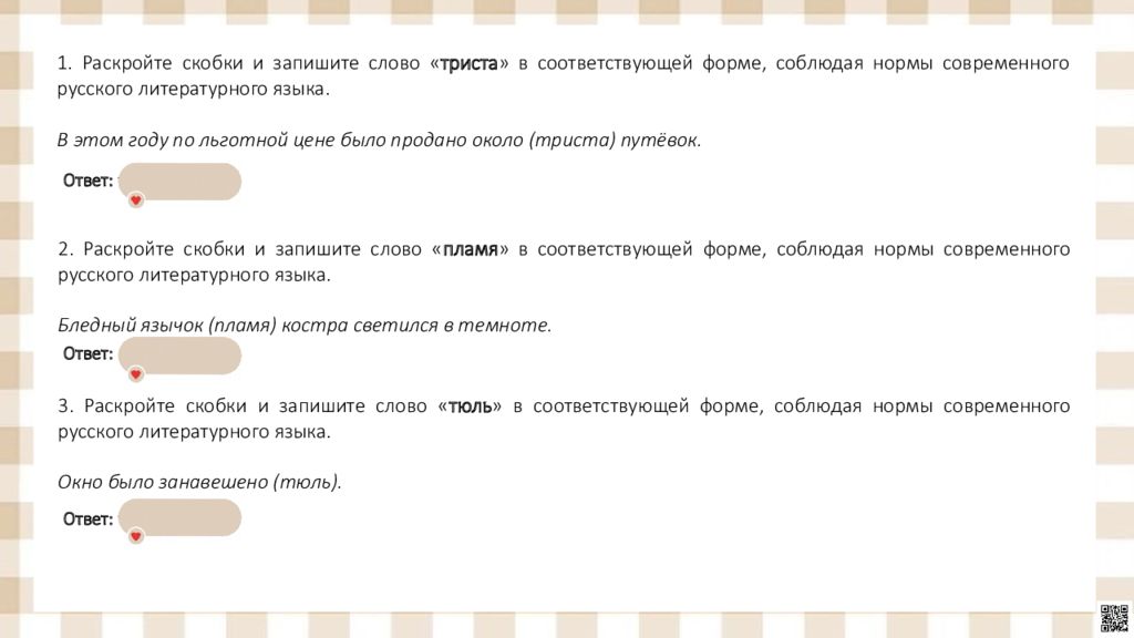 1. Раскройте скобки и запишите слово « триста » в соответствующей форме, соблюдая нормы современного русского литературного языка. В этом году по льготной цене было продано около (триста) путёвок. Ответ: трехсот 2. Раскройте скобки и запишите слово « пламя » в соответствующей форме, соблюдая нормы современного русского литературного языка. Бледный язычок (пламя) костра светился в темноте. Ответ: пламени 3. Раскройте скобки и запишите слово « тюль » в соответствующей форме, соблюдая нормы современного русского литературного языка. Окно было занавешено (тюль). Ответ: тюлем