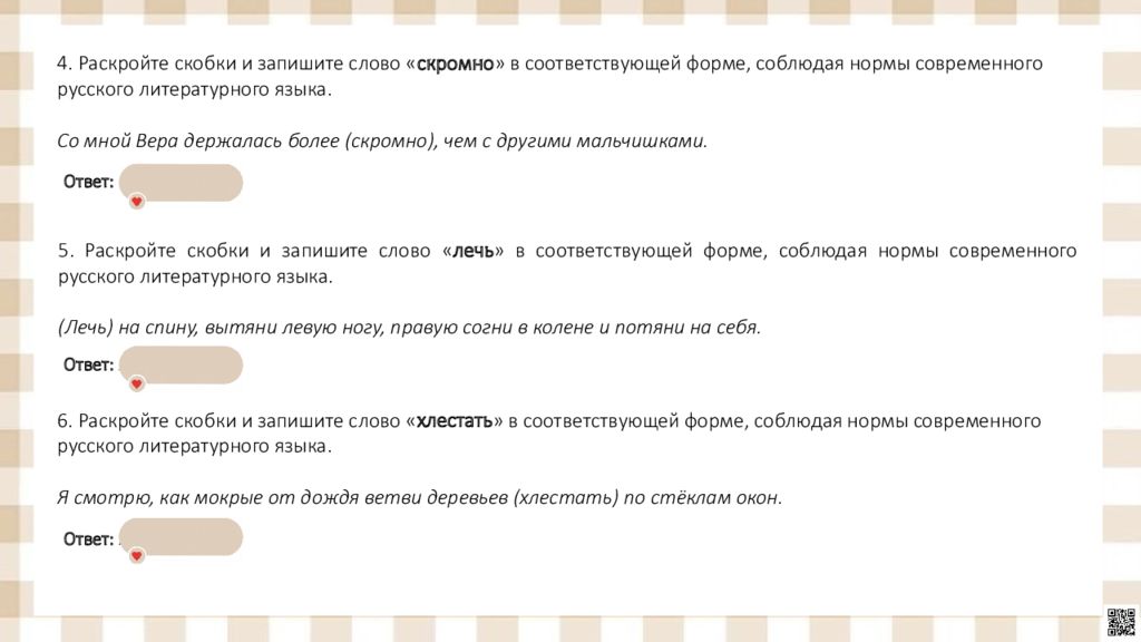4. Раскройте скобки и запишите слово « скромно » в соответствующей форме, соблюдая нормы современного русского литературного языка. Со мной Вера держалась более (скромно), чем с другими мальчишками. Ответ: скромно 5. Раскройте скобки и запишите слово « лечь » в соответствующей форме, соблюдая нормы современного русского литературного языка. (Лечь) на спину, вытяни левую ногу, правую согни в колене и потяни на себя. Ответ: ляг 6. Раскройте скобки и запишите слово « хлестать » в соответствующей форме, соблюдая нормы современного русского литературного языка. Я смотрю, как мокрые от дождя ветви деревьев (хлестать) по стёклам окон. Ответ: хлещут