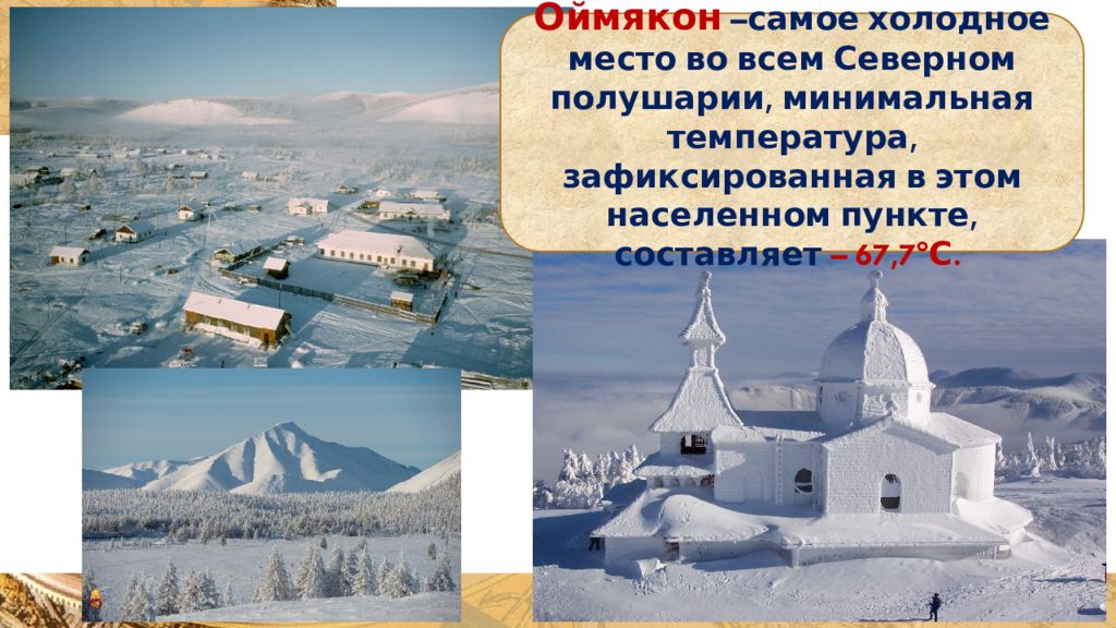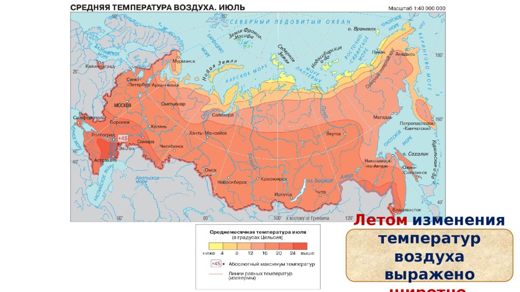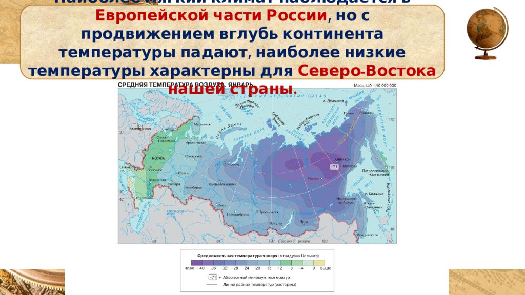 Наиболее мягкий климат наблюдается в Европейской части России, но с продвижением вглубь континента температуры падают, наиболее низкие температуры характерны для Северо-Востока нашей страны.