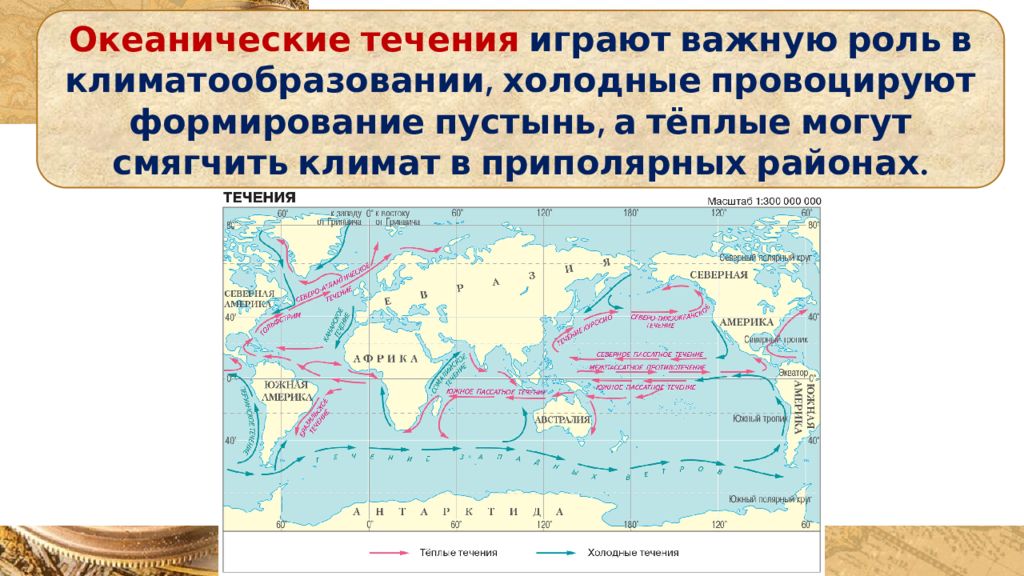 Океанические течения играют важную роль в климатообразовании, холодные провоцируют формирование пустынь, а тёплые могут смягчить климат в приполярных районах.