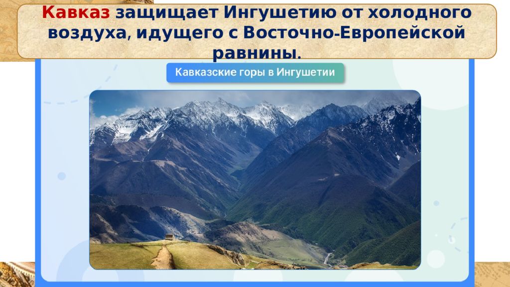 Кавказ защищает Ингушетию от холодного воздуха, идущего с Восточно-Европейской равнины.