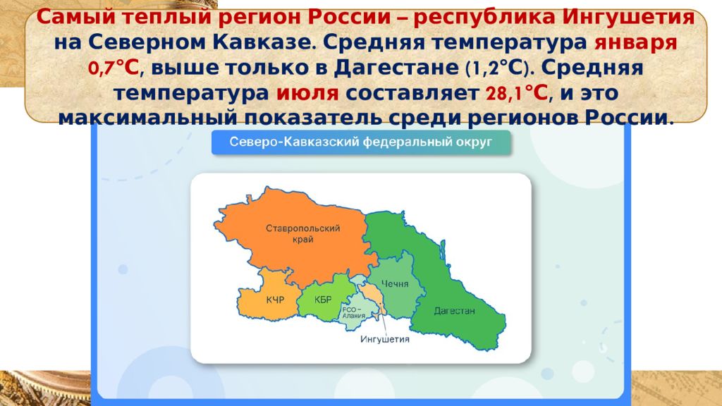Самый теплый регион России – республика Ингушетия на Северном Кавказе. Средняя температура января 0,7°С, выше только в Дагестане (1,2°С). Средняя температура июля составляет 28,1°С, и это максимальный показатель среди регионов России.