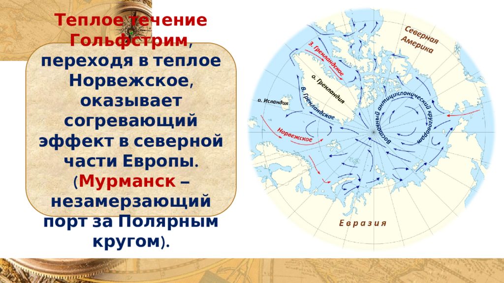 Теплое течение Гольфстрим, переходя в теплое Норвежское, оказывает согревающий эффект в северной части Европы. ( Мурманск – незамерзающий порт за Полярным кругом).
