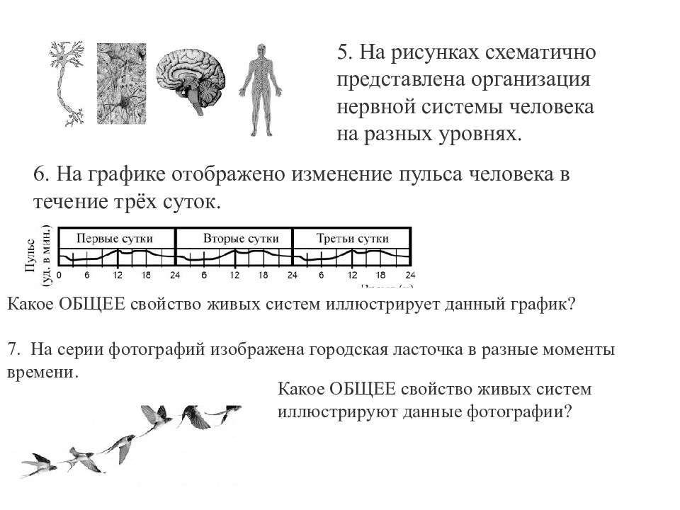 5. На рисунках схематично представлена организация нервной системы человека на разных уровнях. 6. На графике отображено изменение пульса человека в течение трёх суток. Какое ОБЩЕЕ свойство живых систем иллюстрирует данный график? 7. На серии фотографий изображена городская ласточка в разные моменты времени. Какое ОБЩЕЕ свойство живых систем иллюстрируют данные фотографии?