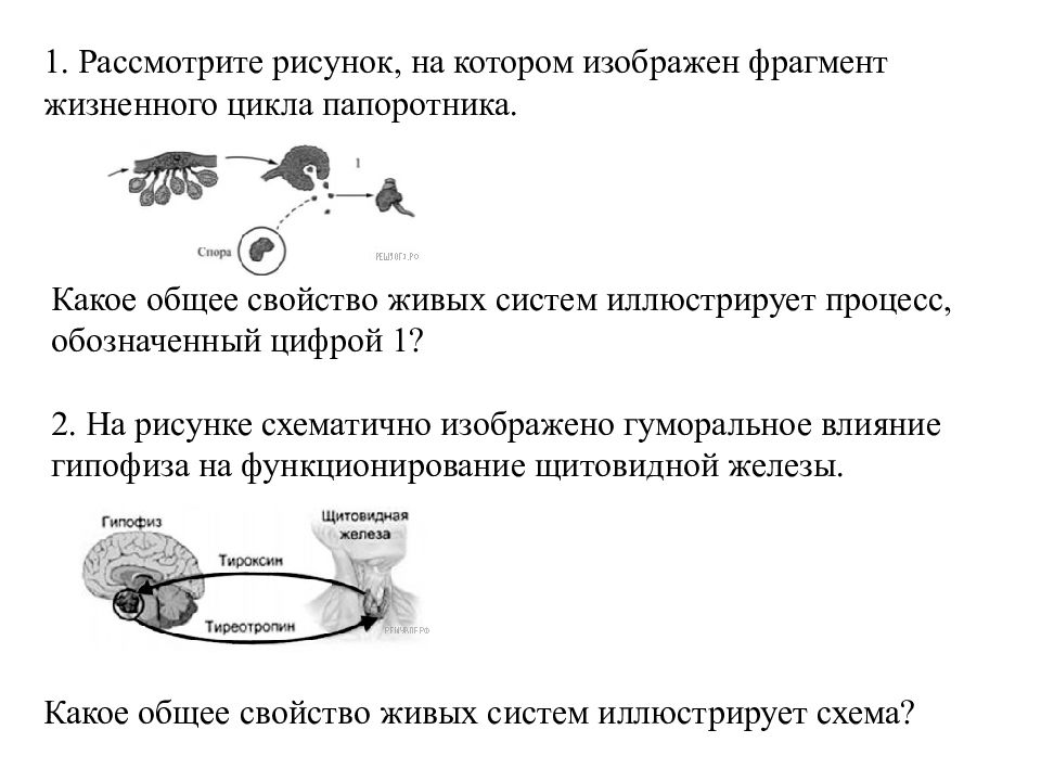 1. Рассмотрите рисунок, на котором изображен фрагмент жизненного цикла папоротника. Какое общее свойство живых систем иллюстрирует процесс, обозначенный цифрой 1? 2. На рисунке схематично изображено гуморальное влияние гипофиза на функционирование щитовидной железы. Какое общее свойство живых систем иллюстрирует схема?