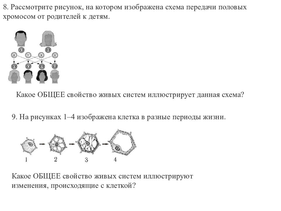 8. Рассмотрите рисунок, на котором изображена схема передачи половых хромосом от родителей к детям. Какое ОБЩЕЕ свойство живых систем иллюстрирует данная схема? 9. На рисунках 1–4 изображена клетка в разные периоды жизни. Какое ОБЩЕЕ свойство живых систем иллюстрируют изменения, происходящие с клеткой?