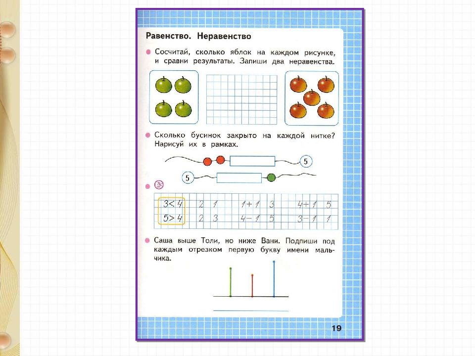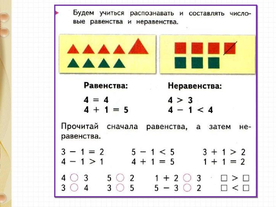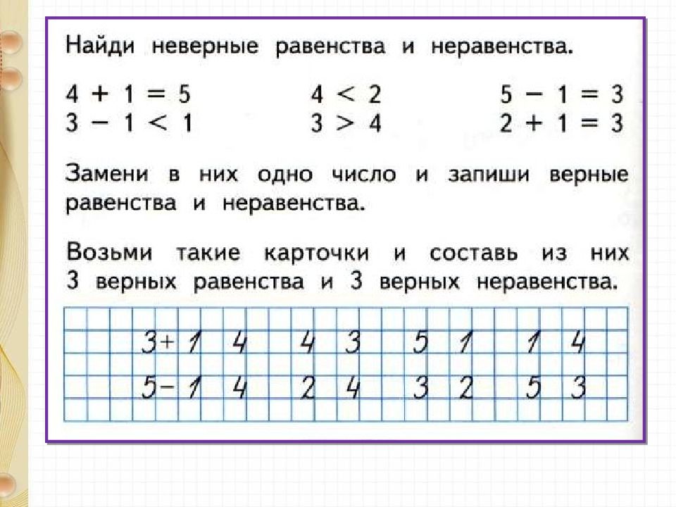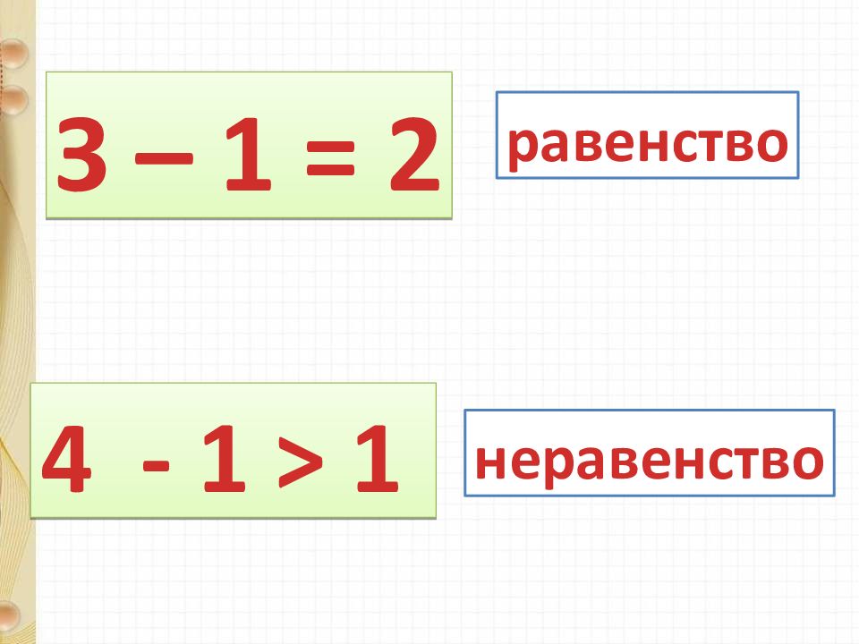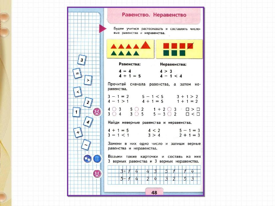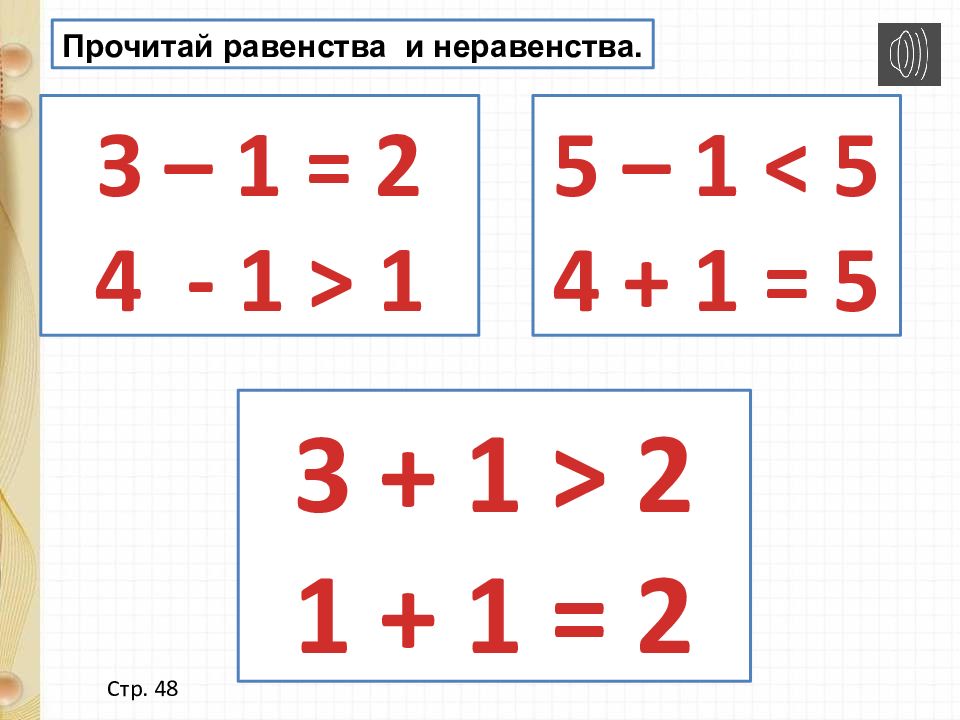 З – 1 = 2 4 - 1 > 1 5 – 1 < 5 4 + 1 = 5 3 + 1 > 2 1 + 1 = 2 Стр. 48 Прочитай равенства и неравенства.