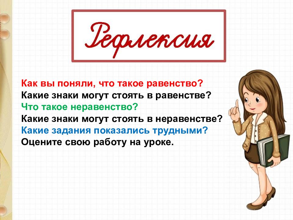 Как вы поняли, что такое равенство? Какие знаки могут стоять в равенстве? Что такое неравенство? Какие знаки могут стоять в неравенстве? Какие задания показались трудными? Оцените свою работу на уроке.