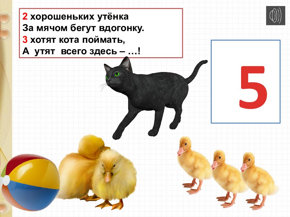 2 хорошеньких утёнка За мячом бегут вдогонку. 3 хотят кота поймать, А утят всего здесь – …! 5