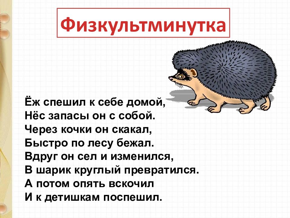 Ёж спешил к себе домой, Нёс запасы он с собой. Через кочки он скакал, Быстро по лесу бежал. Вдруг он сел и изменился, В шарик круглый превратился. А потом опять вскочил И к детишкам поспешил. Физкультминутка