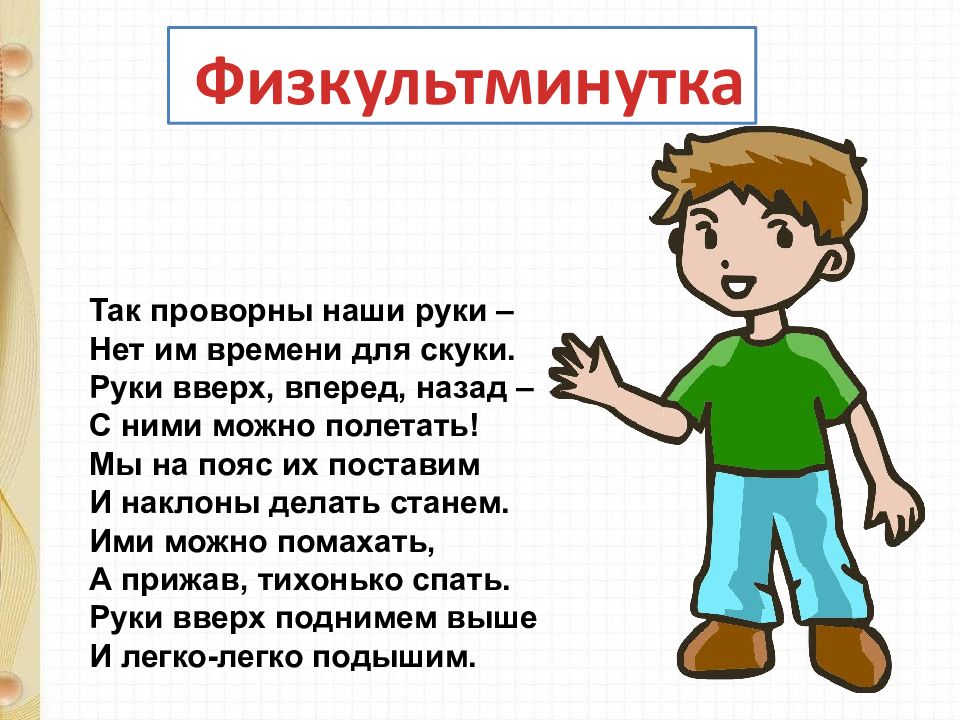 Физкультминутка Так проворны наши руки – Нет им времени для скуки. Руки вверх, вперед, назад – С ними можно полетать! Мы на пояс их поставим И наклоны делать станем. Ими можно помахать, А прижав, тихонько спать. Руки вверх поднимем выше И легко-легко подышим.