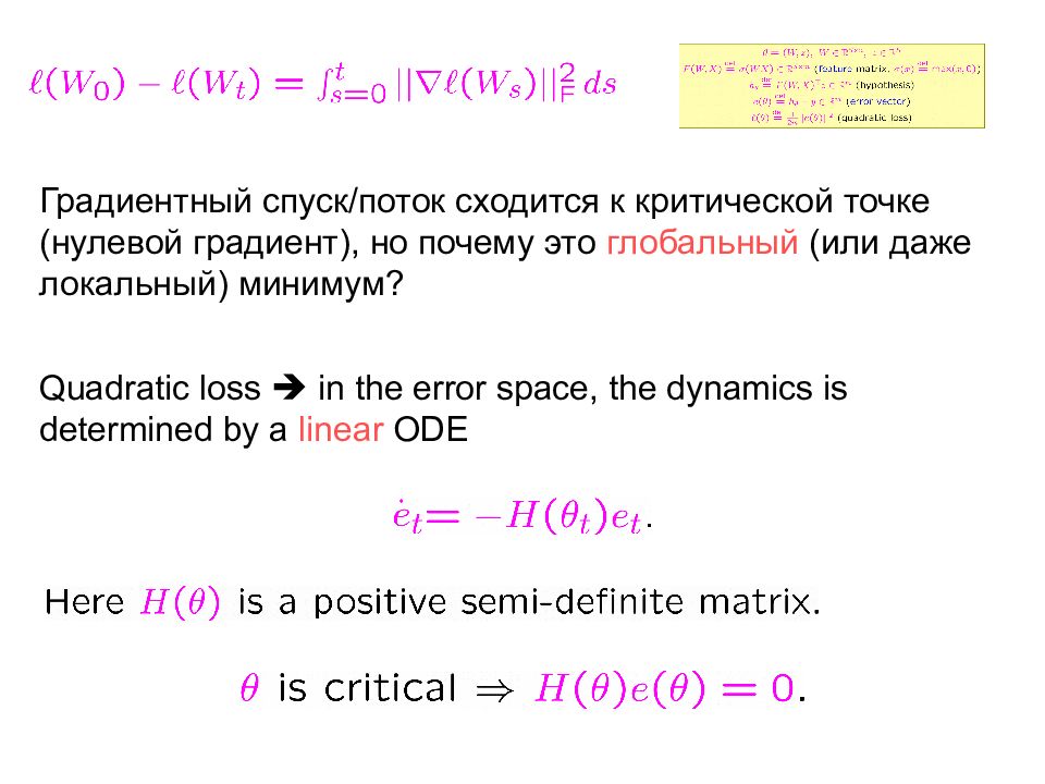 Градиентный спуск / поток сходится к критической точке ( нулевой градиент ), но почему это глобальный ( или даже локальный ) минимум ? Quadratic loss in the error space, the dynamics is determined by a linear ODE